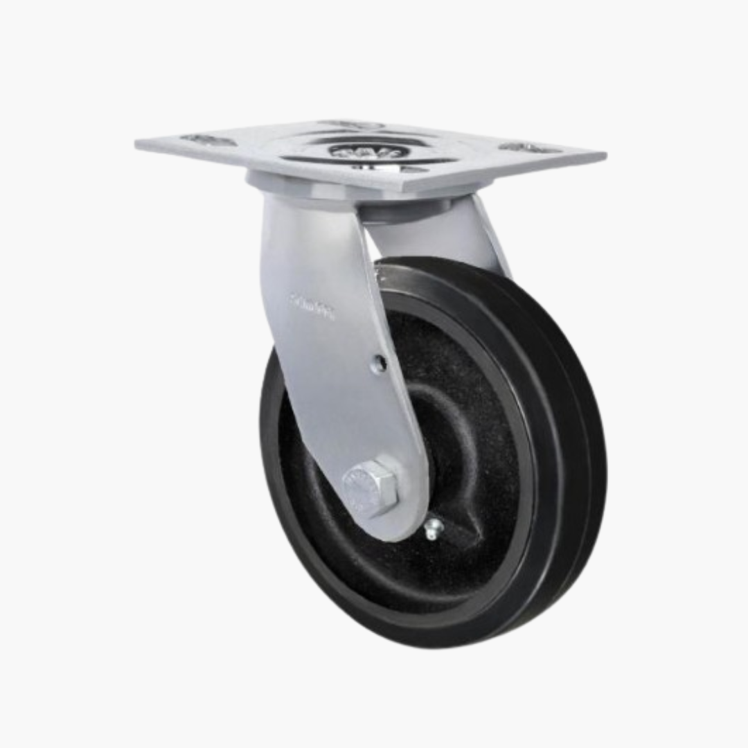 Roda B: Borracha Moldada. Dureza: 80 Shore A. (-20ºC e +70ºC). Produzidas com revestimento de borracha moldada vulcanizada em núcleo de ferro fundido cinzento. Rodam com suavidade e baixo nível de ruídos, absorvem choques e vibrações. São resistentes a abrasão e produtos químicos. Podem ser utilizadas em velocidades de até 10km/h quando montadas com rolamento de esferas.