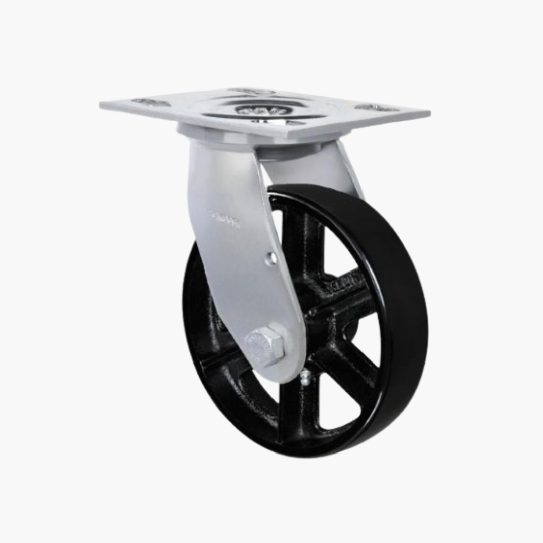 Roda F: Ferro Fundido. Dureza: 160 Brinell. (-40 a +400ºC). Produzidas com ferro fundido cinzento, rodam com muita facilidade e proporcionam grande redução do esforço de movimentação. São muito resistentes e suportam cargas e temperaturas elevadas. Não são indicadas para a utilização quando o nível de ruídos e a conservação do piso são necessários.