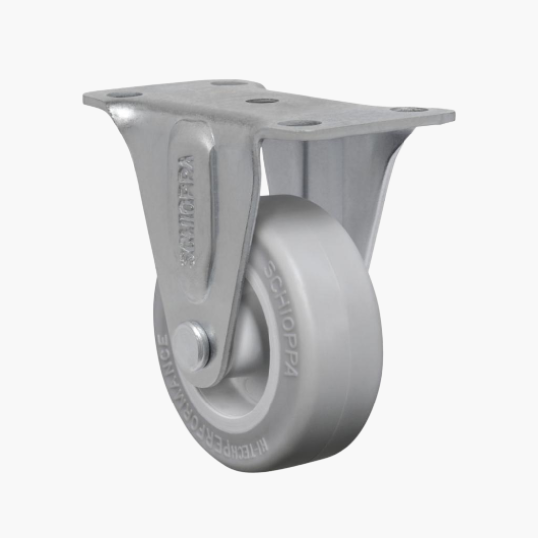 Roda SP: Borracha Termoplástica Extra Macia. Dureza: 65 Shore A. (-10ºC a +50ºC). Rodas injetadas com revestimento em borracha termoplástica extra macia e núcleo em polipropileno copolímero recicláveis. Suas vantagens são o baixíssimo nível de ruído no deslocamento e a redução de vibrações. Indicadas para movimentações de cargas leves, proporcionam excelente proteção ao piso, resistência regular a impactos e boa resistência a meios químicos. A velocidade de trabalho indicada é até 4km/h.