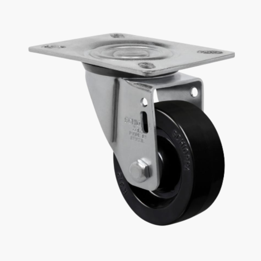 Roda TM: Termic. Dureza: 90 Shore D. (0 a +200ºC). Fabricadas com resina fenólica (baquelite), moldadas sob alta pressão e calor. Indicadas para utilização em aplicações em ambientes com temperaturas elevadas. Possuem boas propriedades mecânicas, não deformam com carga estática, e rolam com facilidade. São resistentes a maioria dos produtos químicos.