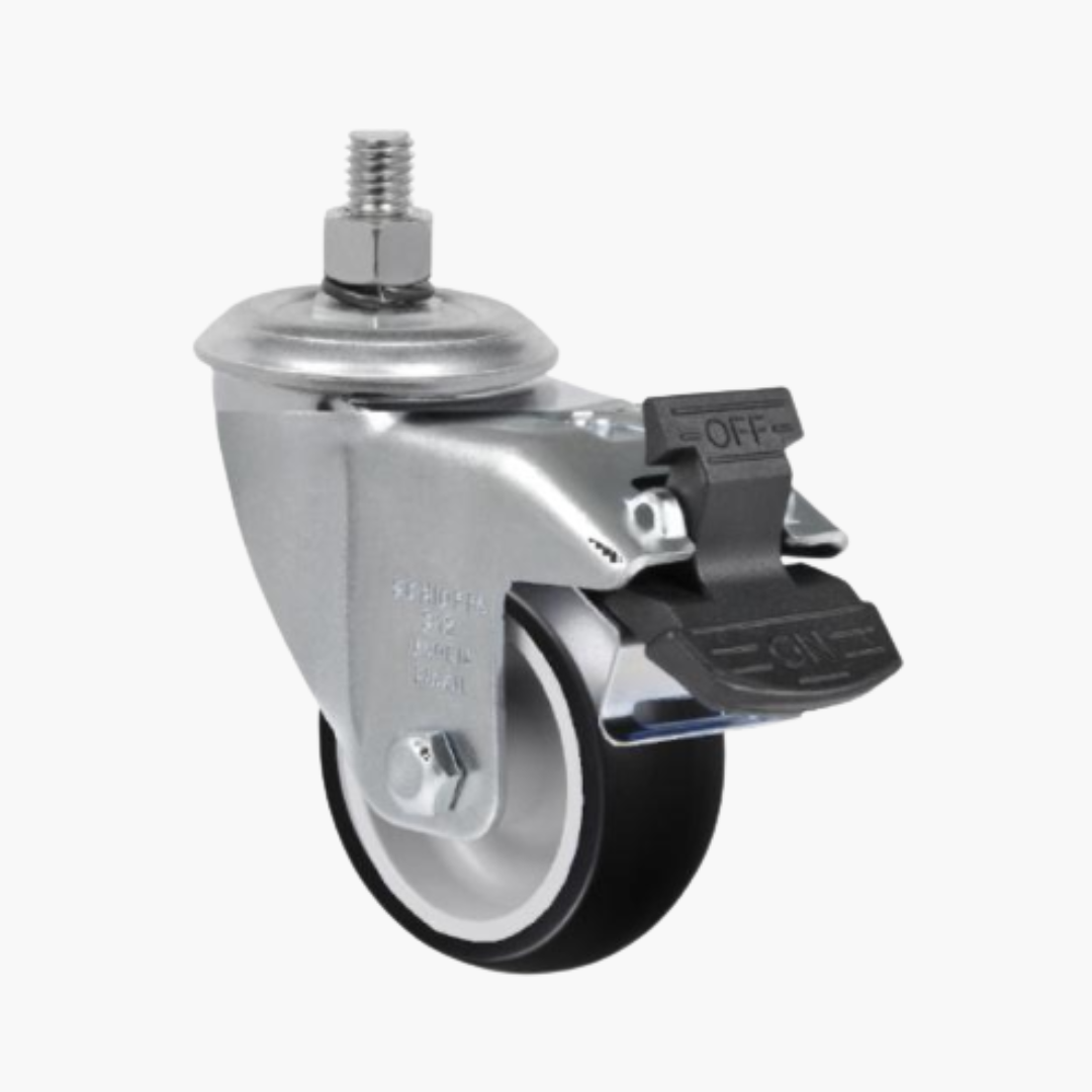 Garfo: Fabricado em chapa estampada e cabeçote com dupla pista de esferas, acabamento zincado. Eixo da roda parafusado.