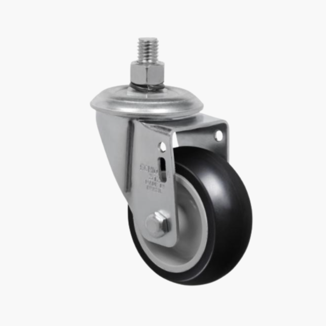 Garfo: Fabricado em chapa estampada e cabeçote com dupla pista de esferas, acabamento zincado. Eixo da roda parafusado.
