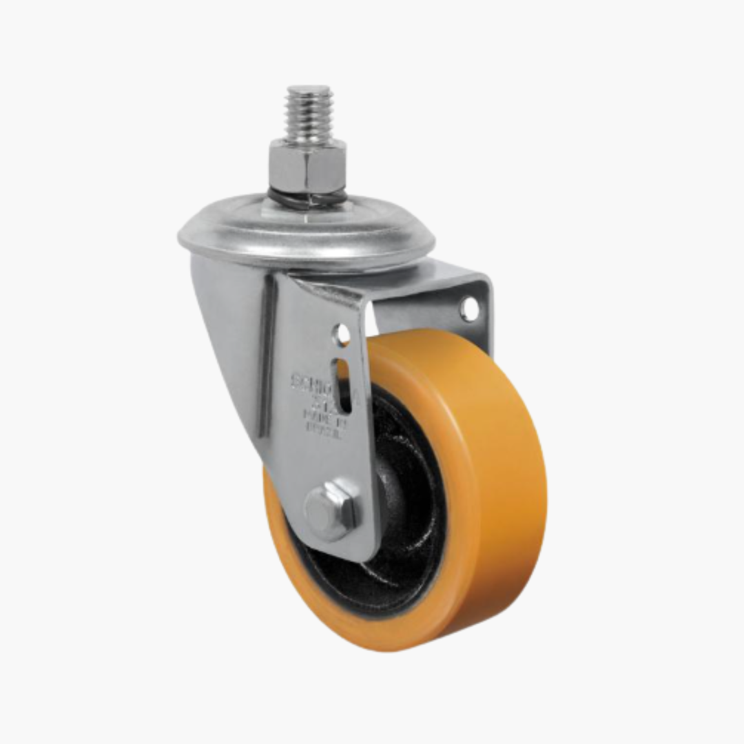 Garfo: Fabricado em chapa estampada e cabeçote com dupla pista de esferas, acabamento zincado. Eixo da roda parafusado.