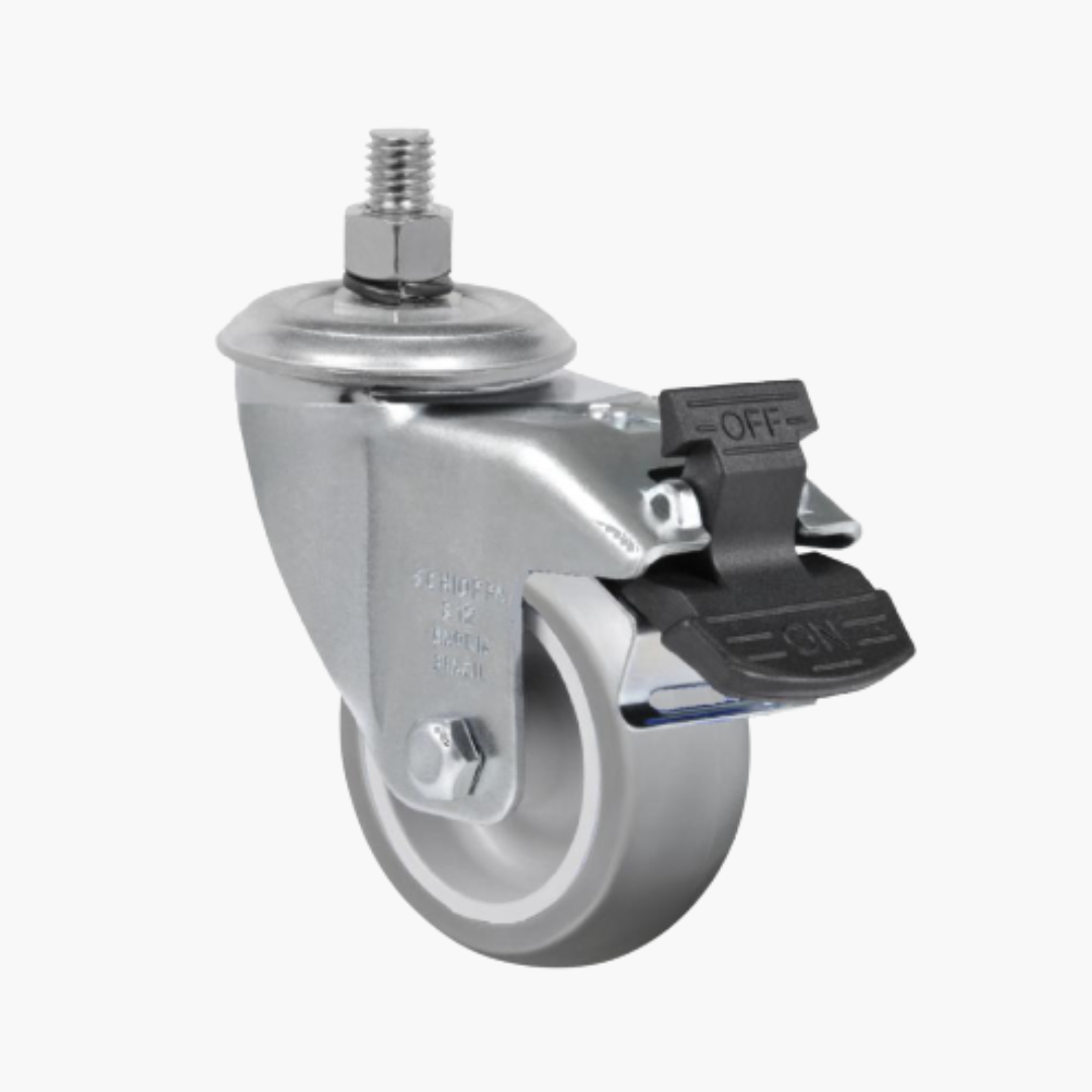 Garfo: Fabricado em chapa estampada e cabeçote com dupla pista de esferas, acabamento zincado. Eixo da roda parafusado.