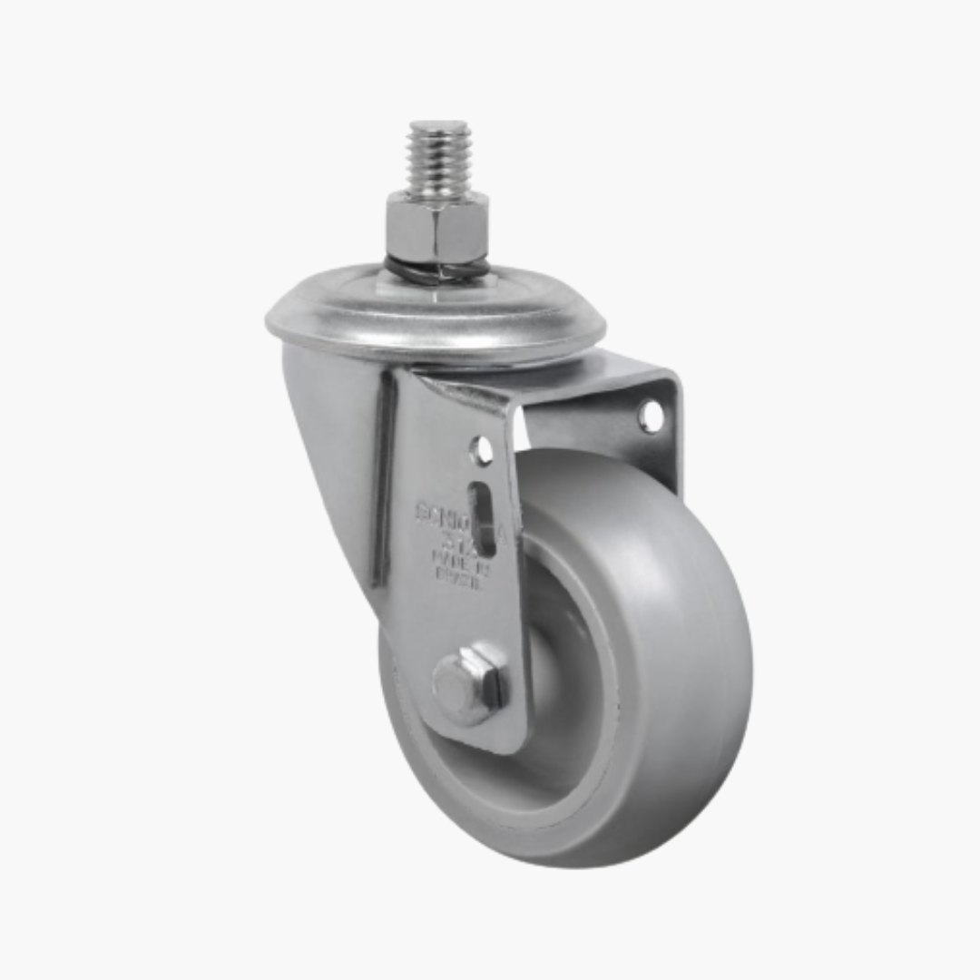 Garfo: Fabricado em chapa estampada e cabeçote com dupla pista de esferas, acabamento zincado. Eixo da roda parafusado.