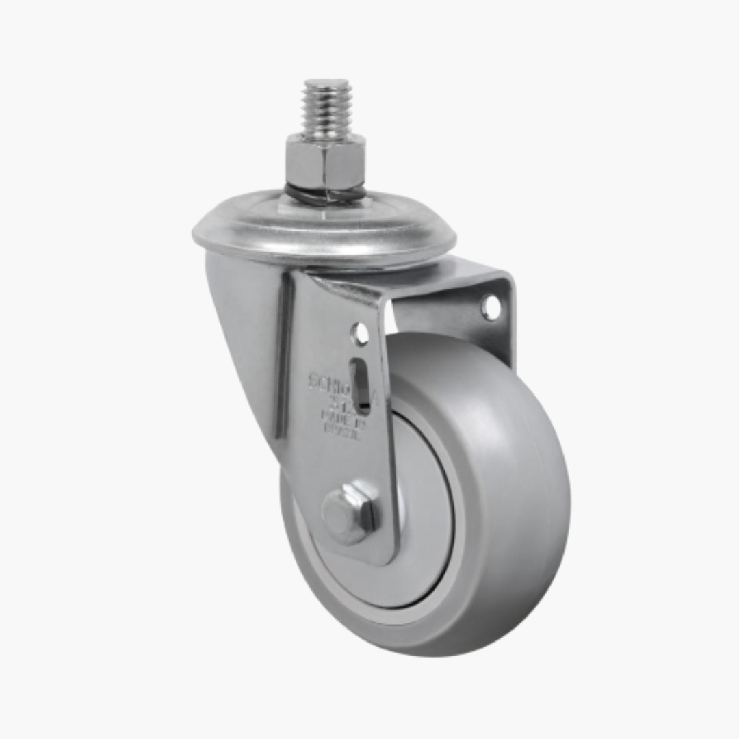 Garfo: Fabricado em chapa estampada e cabeçote com dupla pista de esferas, acabamento zincado. Eixo da roda parafusado.