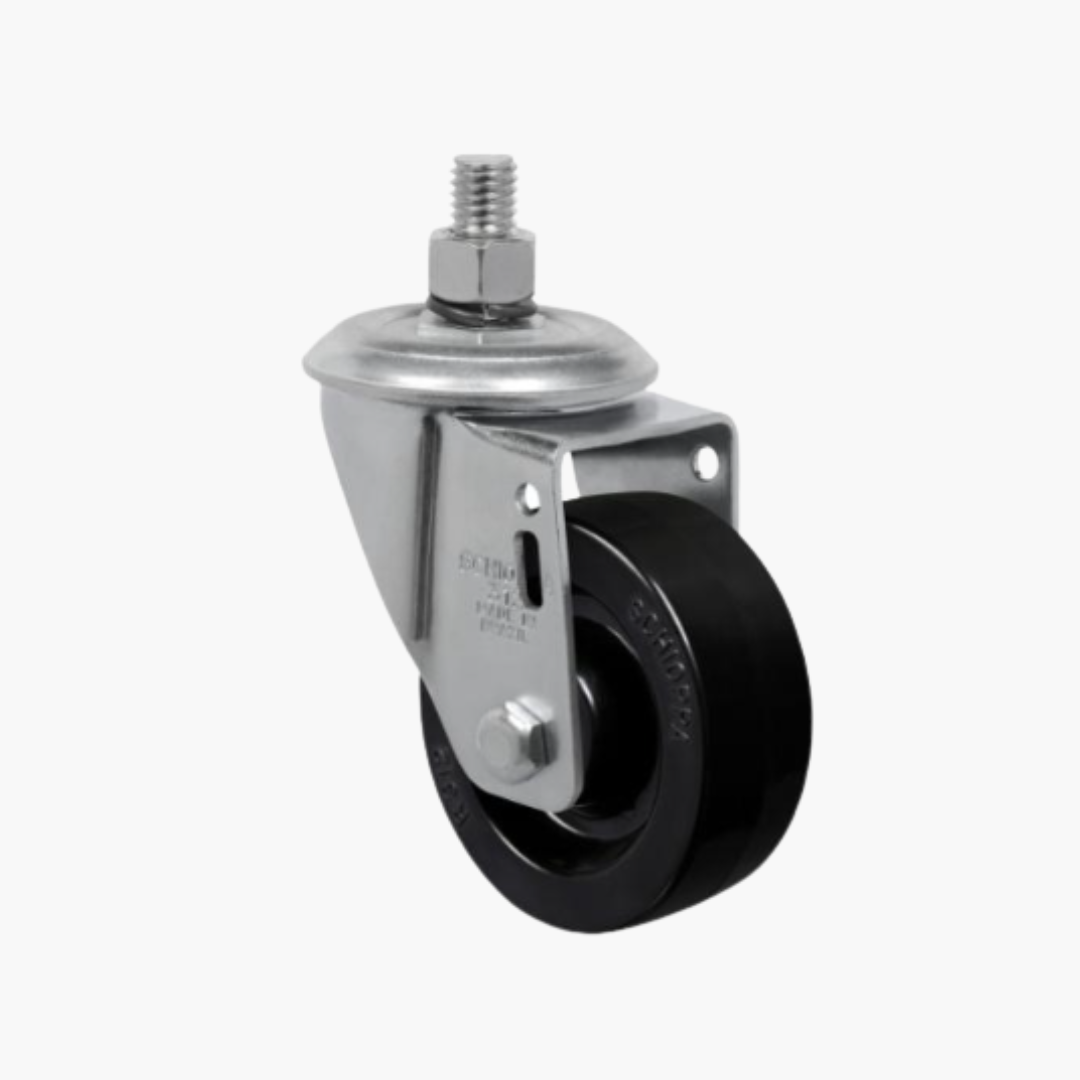 Garfo: Fabricado em chapa estampada e cabeçote com dupla pista de esferas, acabamento zincado. Eixo da roda parafusado.