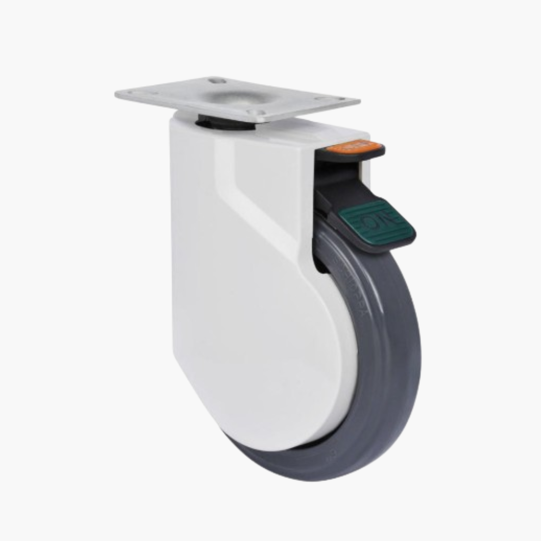 Garfo: Rodízio fabricado com estrutura interna em aço revestido por peças injetadas para diminuir a entrada de poeira e facilitar a limpeza sem tirar o rodízio de serviço. Possui um sistema de freio moderno de fácil acionamento com dois pedais. ON para acionar e OFF soltar.