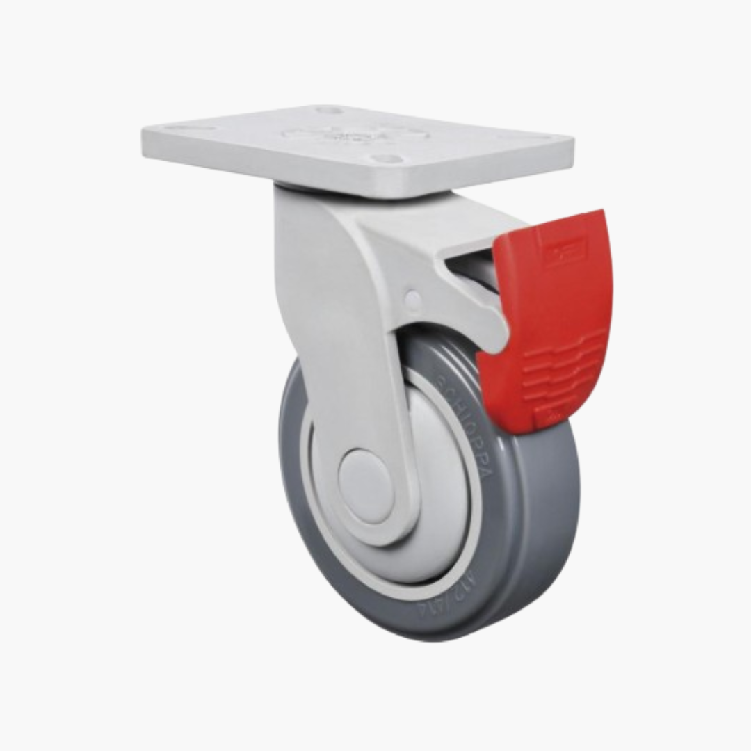 Roda de borracha BP: Composto Termoplástico com PVC. Dureza: 80 Shore A. (-10ºC a +50ºC). Produzidas com revestimento em composto termoplástico com PVC e núcleo em polipropileno copolímero recicláveis. Proporcionam rodagem macia e silenciosa, ótima proteção ao piso, excelente resistência química, boa resistência ao desgaste e aos impactos, resultando em ótima relação custo benefício. A velocidade de trabalho indicada é até 4km/h.