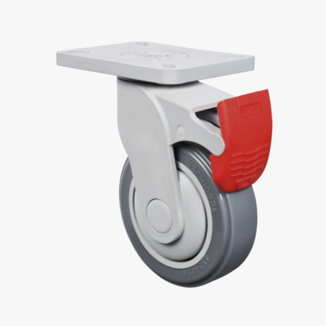Roda de borracha BP: Composto Termoplástico com PVC. Dureza: 80 Shore A. (-10ºC a +50ºC). Produzidas com revestimento em composto termoplástico com PVC e núcleo em polipropileno copolímero recicláveis. Proporcionam rodagem macia e silenciosa, ótima proteção ao piso, excelente resistência química, boa resistência ao desgaste e aos impactos, resultando em ótima relação custo benefício. A velocidade de trabalho indicada é até 4km/h.