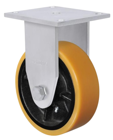 Roda P: Poliuretano Moldado. Dureza: 90 Shore A. (-40ºC a +80ºC). Produzidas com revestimento em poliuretano moldado e núcleo em ferro fundido cinzento. Ideais para aplicações nos mais diversos tipos de superfícies e ambientes. Suportam altas cargas, protegem o piso, necessitam de menor esforço para movimentação, produzem baixo nível de ruídos no deslocamento e têm excelente durabilidade. Possuem excelente resistência a abrasão, impactos, intempéries e produtos químicos como graxas, óleos, sais e solventes. Podem ser utilizadas a uma velocidade de até 20km/h quando montadas com rolamento de esferas.