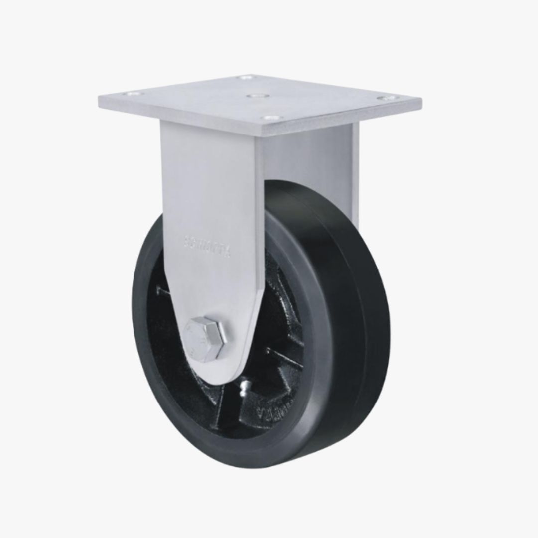 RODA B - Borracha Moldada. Dureza: 80 Shore A. (-20ºC e +70ºC). Produzidas com revestimento de borracha moldada vulcanizada em núcleo de ferro fundido cinzento. Rodam com suavidade e baixo nível de ruídos, absorvem choques e vibrações. São resistentes a abrasão e produtos químicos. Podem ser utilizadas em velocidades de até 20km/h quando montadas com rolamento de esferas.