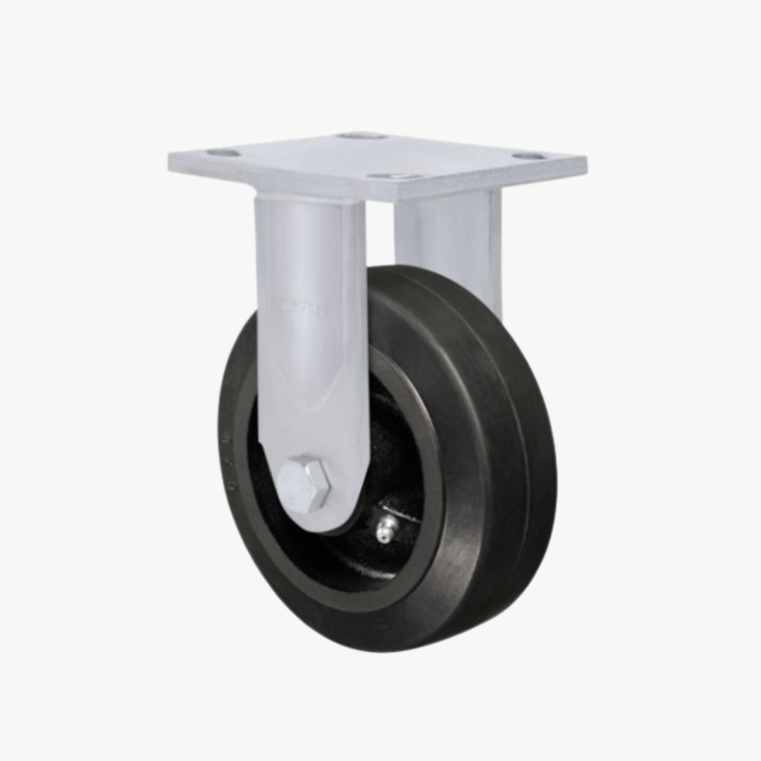RODA B: Borracha Moldada. Dureza: 80 Shore A. (-20ºC e +70ºC). Produzidas com revestimento de borracha moldada vulcanizada em núcleo de ferro fundido cinzento. Rodam com suavidade e baixo nível de ruídos, absorvem choques e vibrações. São resistentes a abrasão e produtos químicos. Podem ser utilizadas em velocidades de até 20km/h quando montadas com rolamento de esferas.