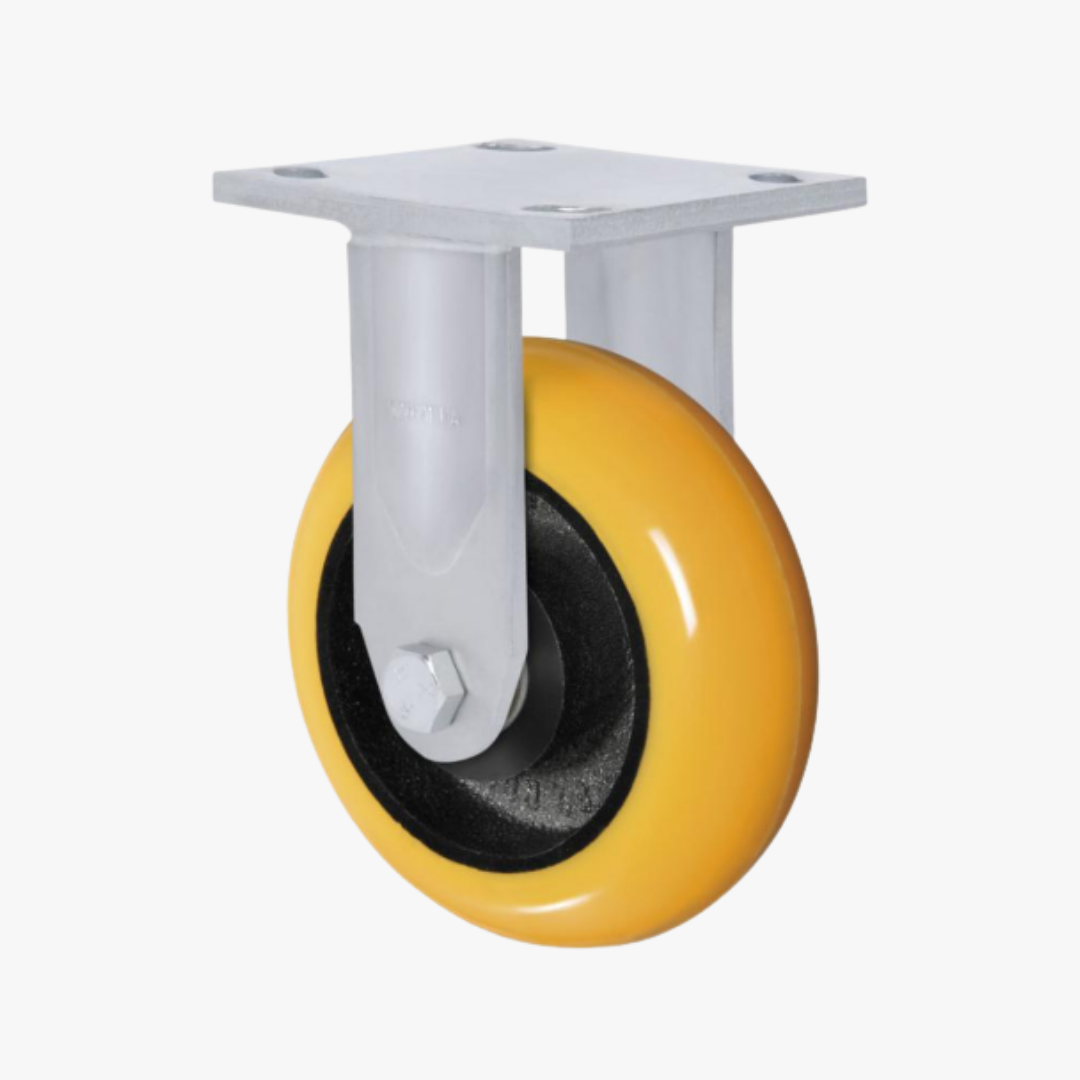 RODA BC: Poliuretano Moldado - Round. Dureza: 90 Shore A. (-40ºC a +80ºC). Produzidas com revestimento em poliuretano moldado e núcleo em ferro fundido cinzento. O perfil arredondado da face rodante proporciona redução da área de contato com o piso, facilidade para movimentação e manobras, diminuindo o esforço de manuseio e o nível de ruído no deslocamento. Proporciona durabilidade superior por ter maior camada de poliuretano do que as rodas convencionais. Possuem excelente resistência a abrasão, a impactos, a intempéries e a produtos químicos como graxas, óleos, sais e solventes. Podem ser utilizadas a uma velocidade de até 20km/h quando montadas com rolamento de esferas.
