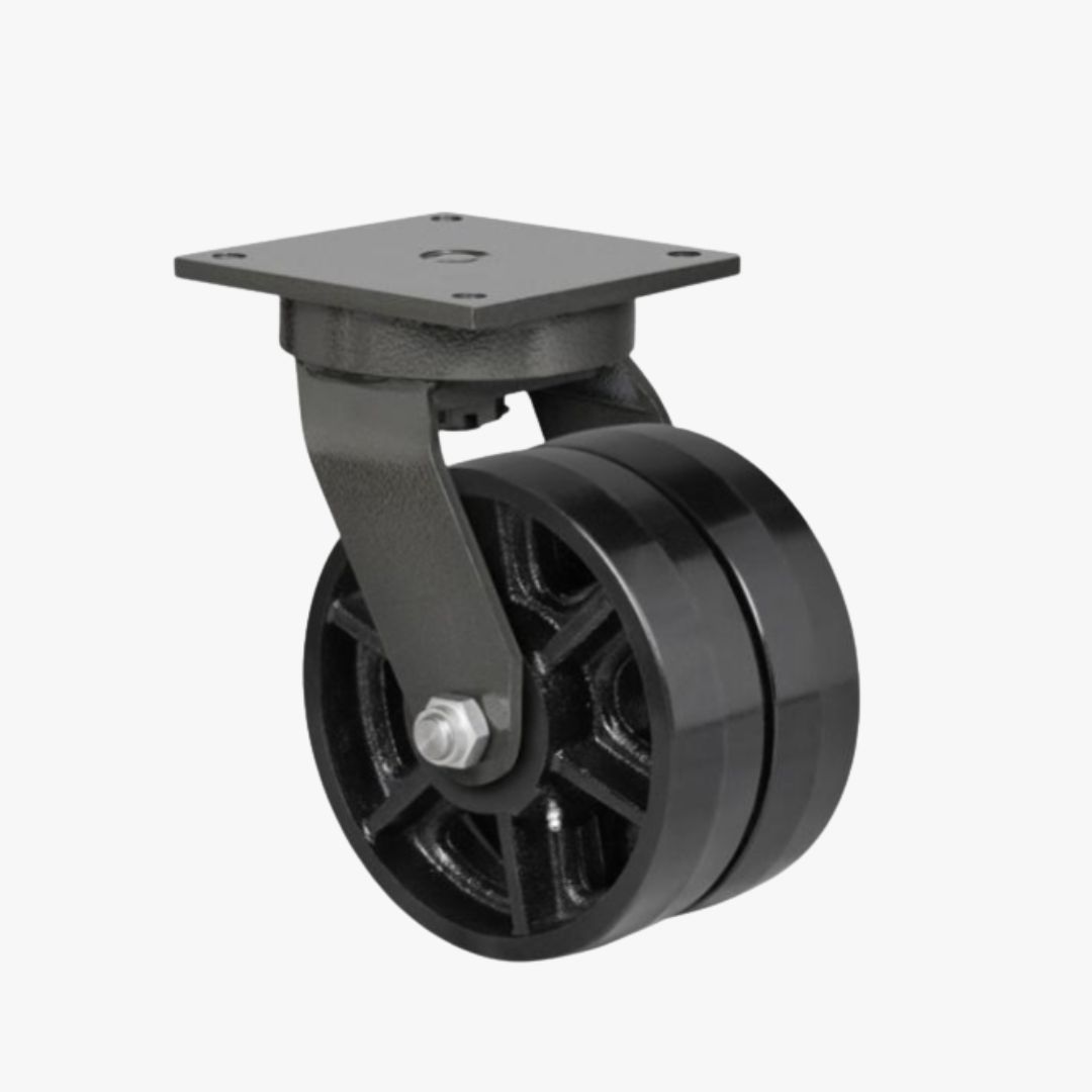 RODA F - Ferro Fundido. Dureza: 160 Brinell. (-40 a +400ºC). Produzidas com ferro fundido cinzento, rodam com muita facilidade e proporcionam grande redução do esforço de movimentação. São muito resistentes e suportam cargas e temperaturas elevadas. Não são indicadas para a utilização quando o nível de ruídos e a conservação do piso são necessários.