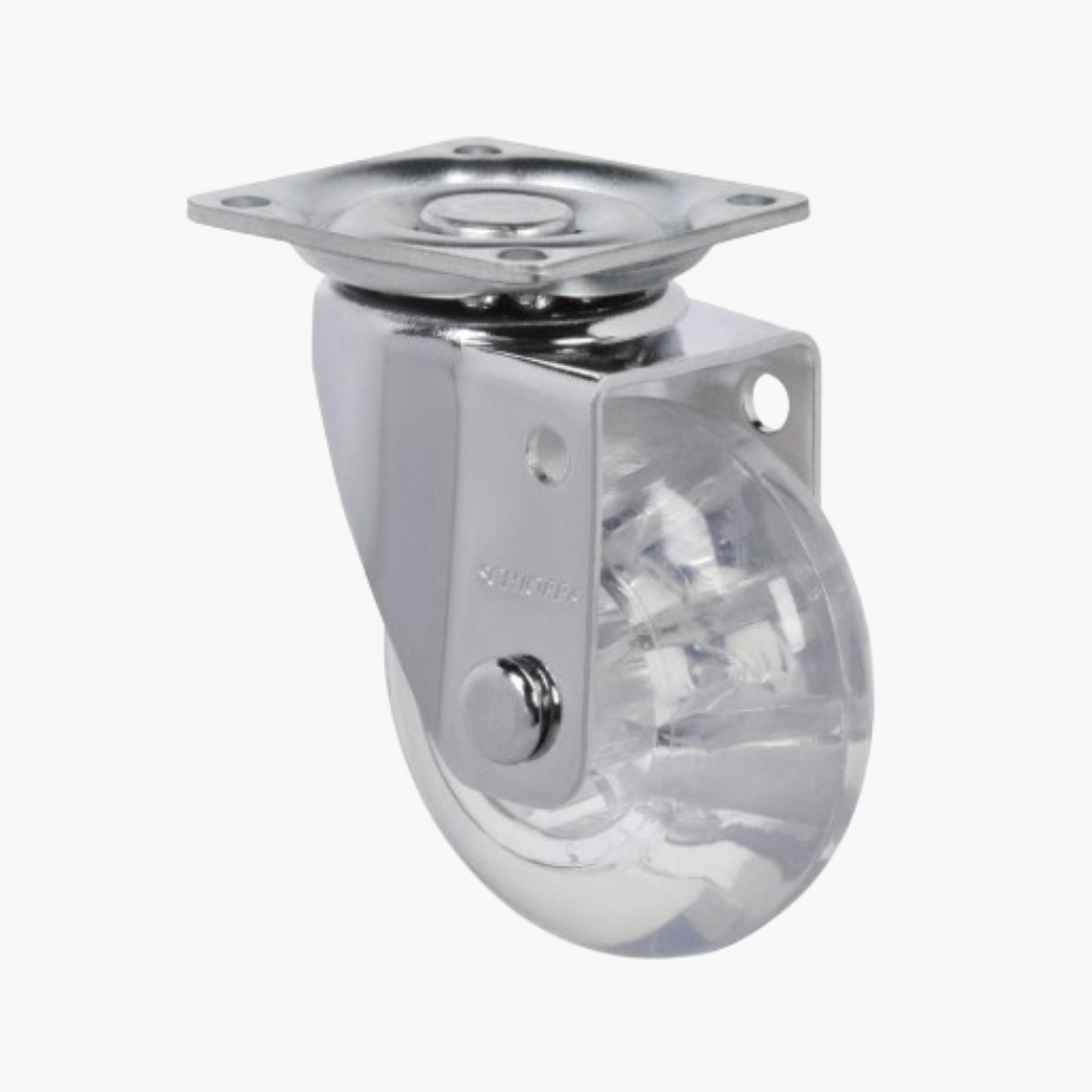Roda Colorgel: Poliuretano Termoplástico Transparente. Dureza: 90 Shore A. (-20ºC a +70ºC). Injetadas com revestimento em poliuretano termoplástico e núcleo em acrílico com várias combinações de cores. Ideal para móveis, rodam com muita facilidade requerendo pouco esforço para movimentação, não deformam sob carga estática e possuem ótima relação custo benefício. Apresentam boa resistência química e a impactos moderados. Produzida com material reciclável.