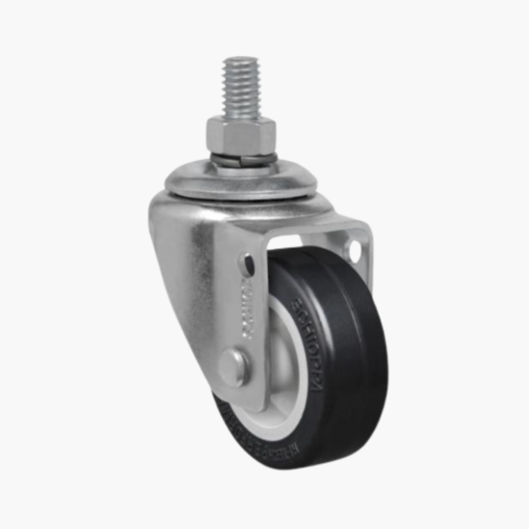 Garfo: Fabricado em chapa estampada e cabeçote com dupla pista de esferas, acabamento zincado. Eixo da roda rebitado.