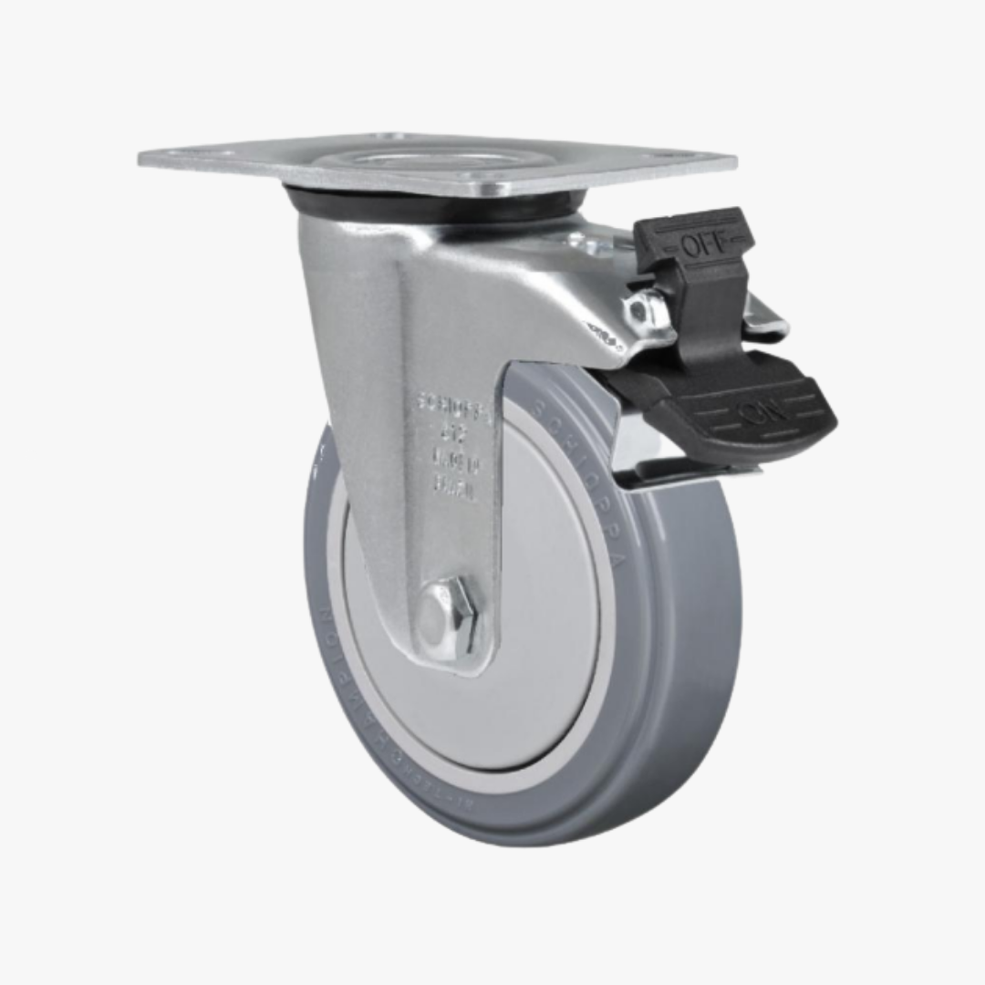 Roda de borracha BP: Composto Termoplástico com PVC. Dureza: 80 Shore A. (-10ºC a +50ºC). Produzidas com revestimento em composto termoplástico com PVC e núcleo em polipropileno copolímero recicláveis. Proporcionam rodagem macia e silenciosa, ótima proteção ao piso, excelente resistência química, boa resistência ao desgaste e aos impactos, resultando em ótima relação custo benefício. A velocidade de trabalho indicada é até 4km/h.