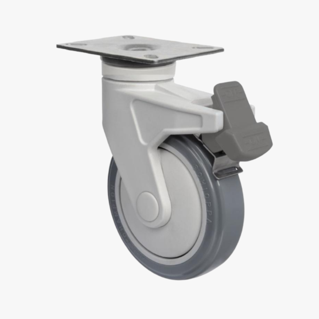 Roda de borracha BP: Composto Termoplástico com PVC. Dureza: 80 Shore A. (-10ºC a +50ºC). Produzidas com revestimento em composto termoplástico com PVC e núcleo em polipropileno copolímero recicláveis. Proporcionam rodagem macia e silenciosa, ótima proteção ao piso, excelente resistência química, boa resistência ao desgaste e aos impactos, resultando em ótima relação custo benefício. A velocidade de trabalho indicada é até 4km/h.