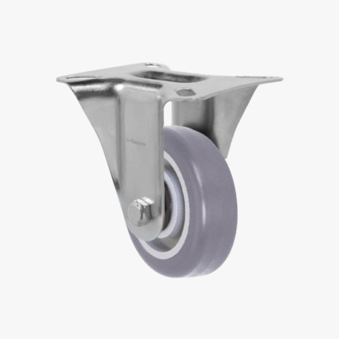 Roda BP : Composto Termoplástico com PVC. Dureza: 80 Shore A. (-10ºC a +50ºC). Produzidas com revestimento em composto termoplástico com PVC e núcleo em polipropileno copolímero recicláveis. Proporcionam rodagem macia e silenciosa, ótima proteção ao piso, excelente resistência química, boa resistência ao desgaste e aos impactos, resultando em ótima relação custo benefício. A velocidade de trabalho indicada é até 4km/h. graxas, óleos minerais e alguns ácidos. A velocidade de trabalho indicada é até 4 km/h.
