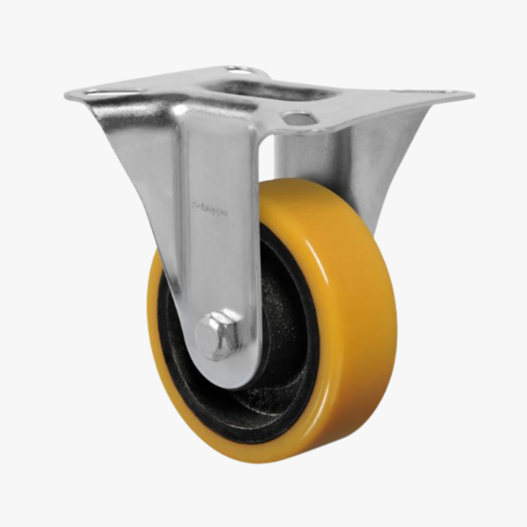 Roda P: Poliuretano Moldado. Dureza: 90 Shore A. (-40ºC a +80ºC). Produzidas com revestimento em poliuretano moldado e núcleo em ferro fundido cinzento. Ideais para aplicações nos mais diversos tipos de superfícies e ambientes. Suportam altas cargas, protegem o piso, necessitam de menor esforço para movimentação, produzem baixo nível de ruídos no deslocamento e têm excelente durabilidade. Possuem excelente resistência a abrasão, impactos, intempéries e produtos químicos como graxas, óleos, sais e solventes. Podem ser utilizadas a uma velocidade de até 4km/h.