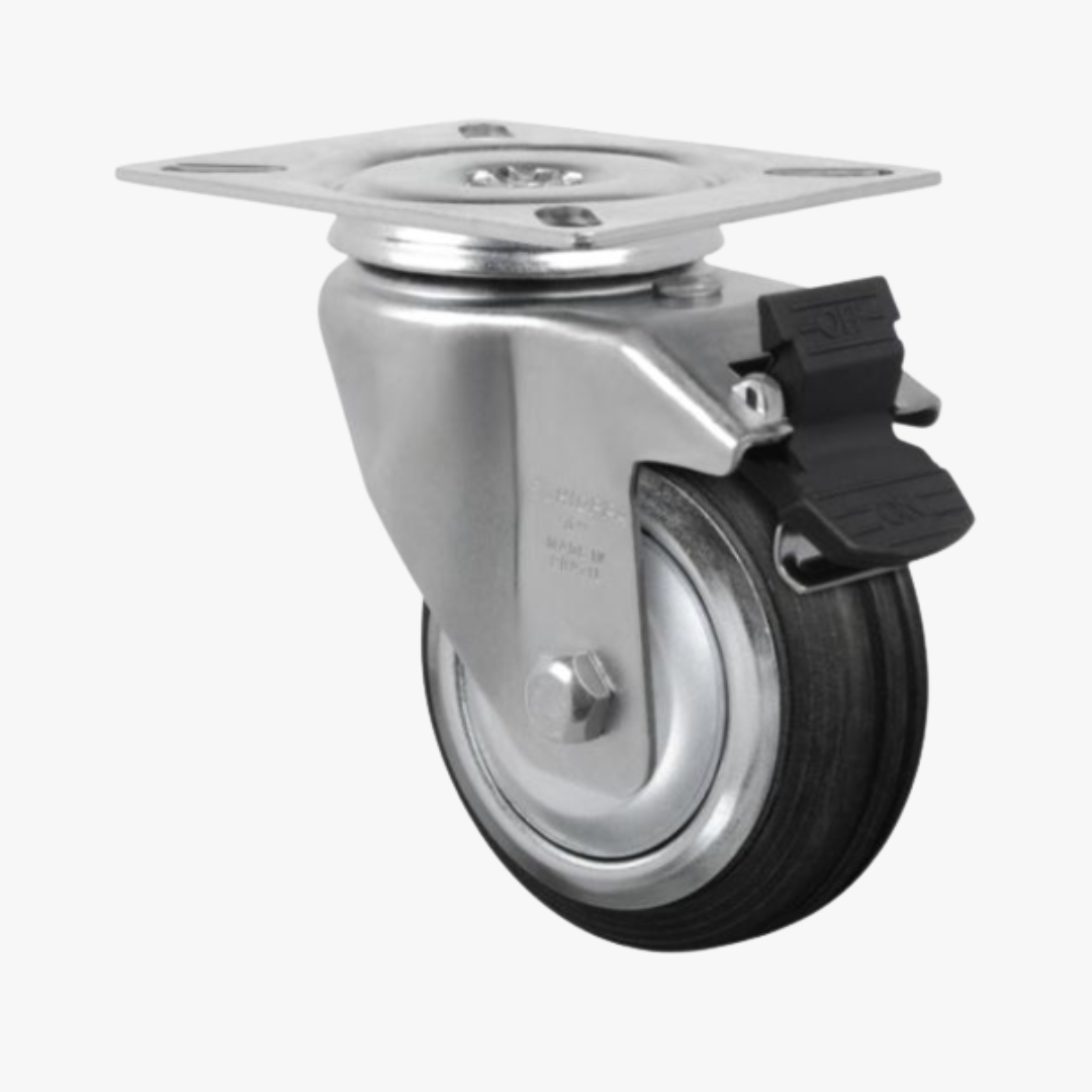 Roda BD: Borracha Moldada com Núcleo em Chapa Estampada. Dureza: 80 Shore A. (-20ºC a +70ºC). Produzidas com aro de borracha maciço, com núcleo em chapas de aço carbono estampado, com acabamento de zincado. São leves e resistentes, tem rodagem macia e silenciosa, e são indicadas para serviços leves em pisos em bom estado. A velocidade de trabalho indicada é até 4 km/h.