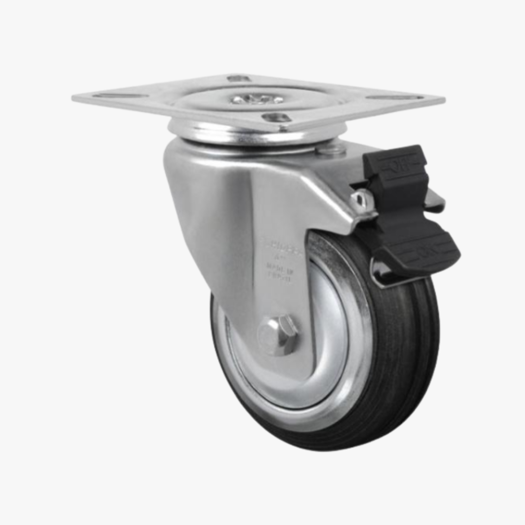 Roda BD: Borracha Moldada com Núcleo em Chapa Estampada. Dureza: 80 Shore A. (-20ºC a +70ºC). Produzidas com aro de borracha maciço, com núcleo em chapas de aço carbono estampado, com acabamento de zincado. São leves e resistentes, tem rodagem macia e silenciosa, e são indicadas para serviços leves em pisos em bom estado. A velocidade de trabalho indicada é até 4 km/h.