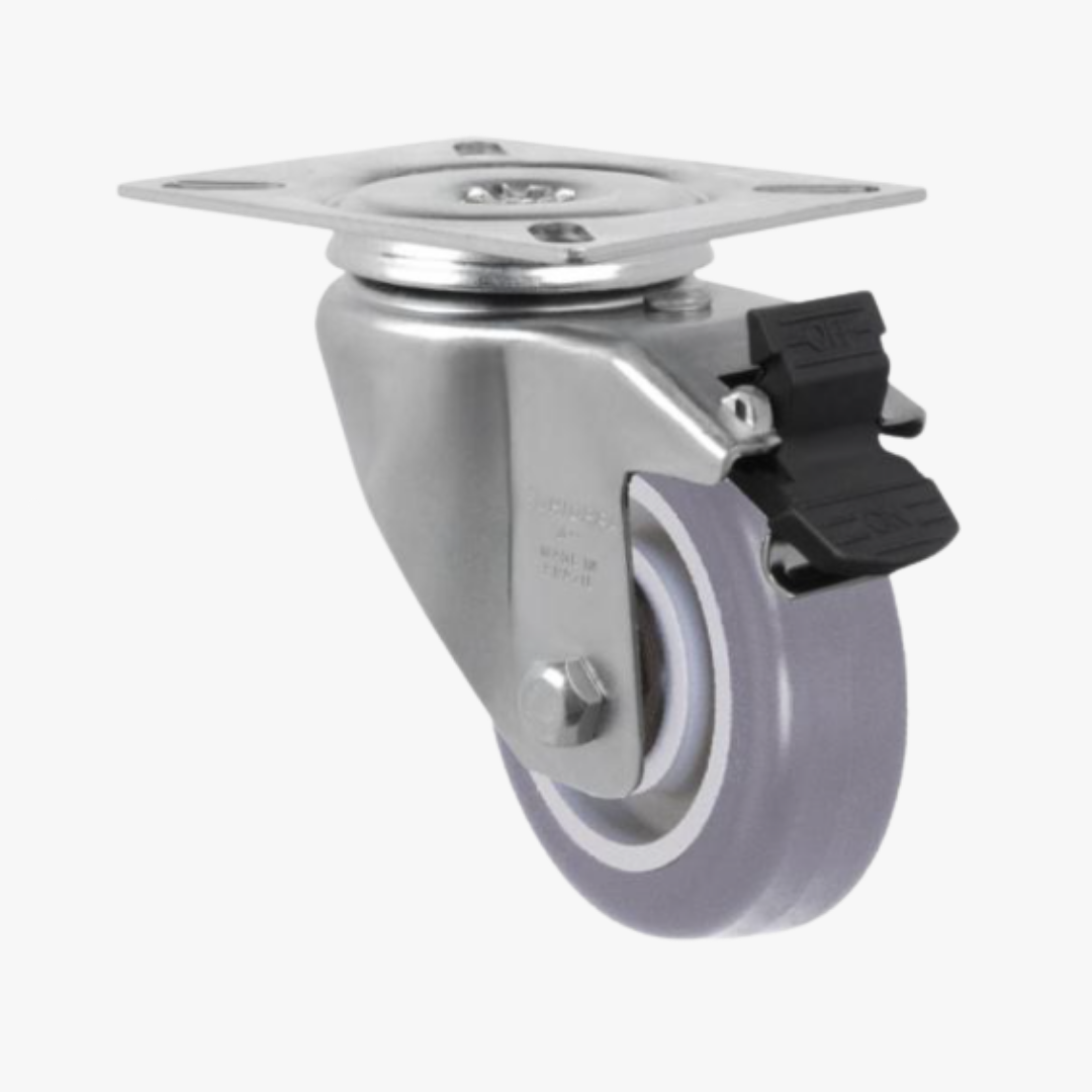Garfo: Fabricado em chapa estampada e cabeçote com dupla pista de esferas, acabamento zincado. Eixo da roda parafusado.