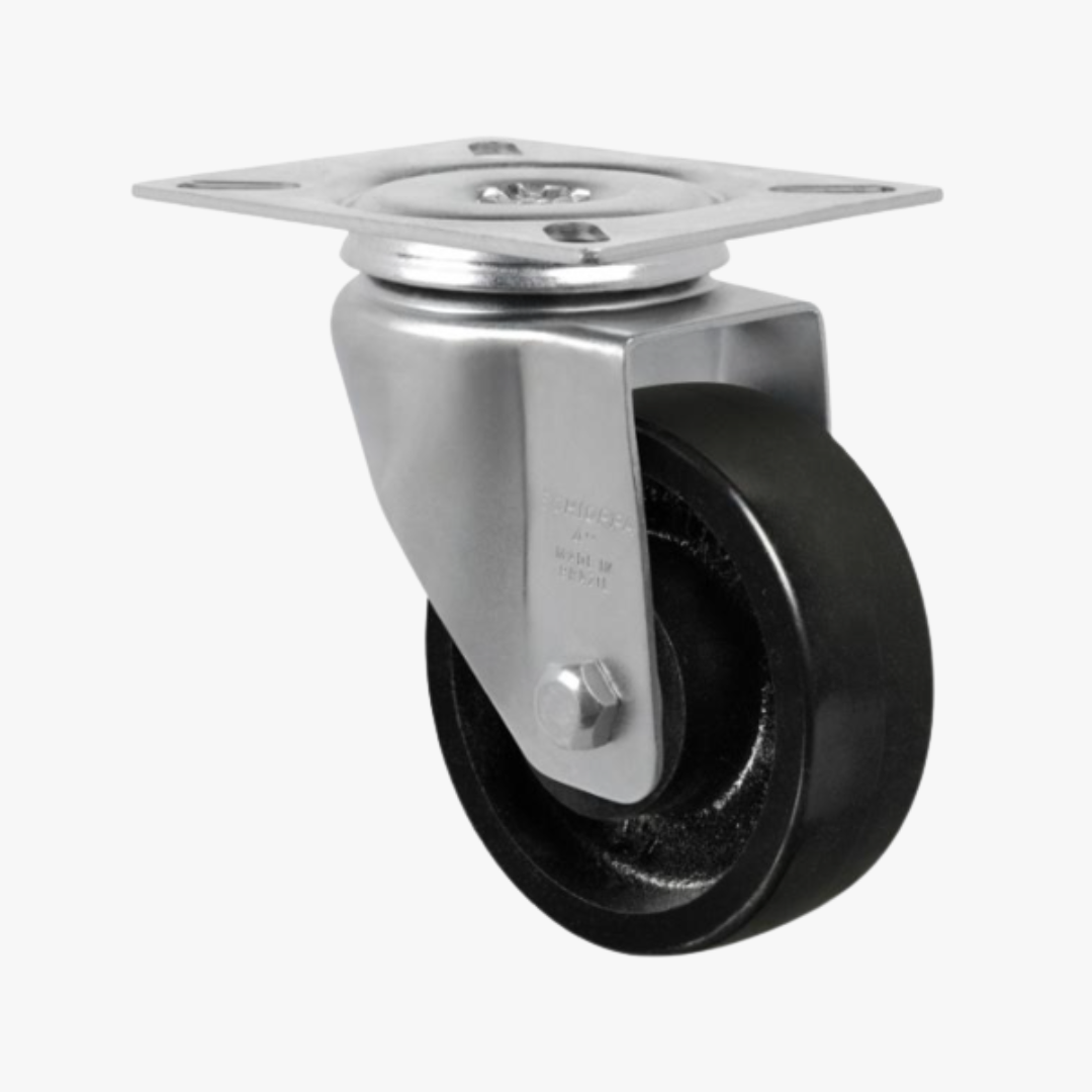 Roda F: Ferro Fundido. Dureza: 160 Brinell. (-40 a +400ºC). Produzidas com ferro fundido cinzento, rodam com muita facilidade e proporcionam grande redução do esforço de movimentação. São muito resistentes e suportam cargas e temperaturas elevadas. Não são indicadas para a utilização quando o nível de ruídos e a conservação do piso são necessários.
