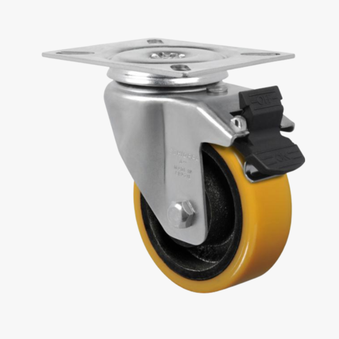 Roda P: Poliuretano Moldado. Dureza: 90 Shore A. (-40ºC a +80ºC). Produzidas com revestimento em poliuretano moldado e núcleo em ferro fundido cinzento. Ideais para aplicações nos mais diversos tipos de superfícies e ambientes. Suportam altas cargas, protegem o piso, necessitam de menor esforço para movimentação, produzem baixo nível de ruídos no deslocamento e têm excelente durabilidade. Possuem excelente resistência a abrasão, impactos, intempéries e produtos químicos como graxas, óleos, sais e solventes. Podem ser utilizadas a uma velocidade de até 4km/h.