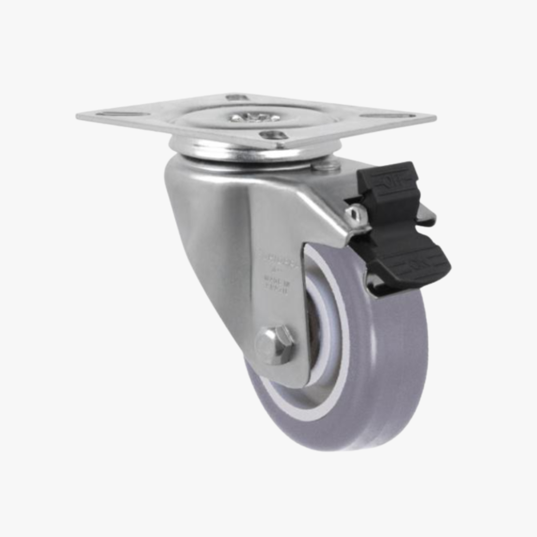 Garfo: Fabricado em chapa estampada e cabeçote com dupla pista de esferas, acabamento zincado. Eixo da roda parafusado.