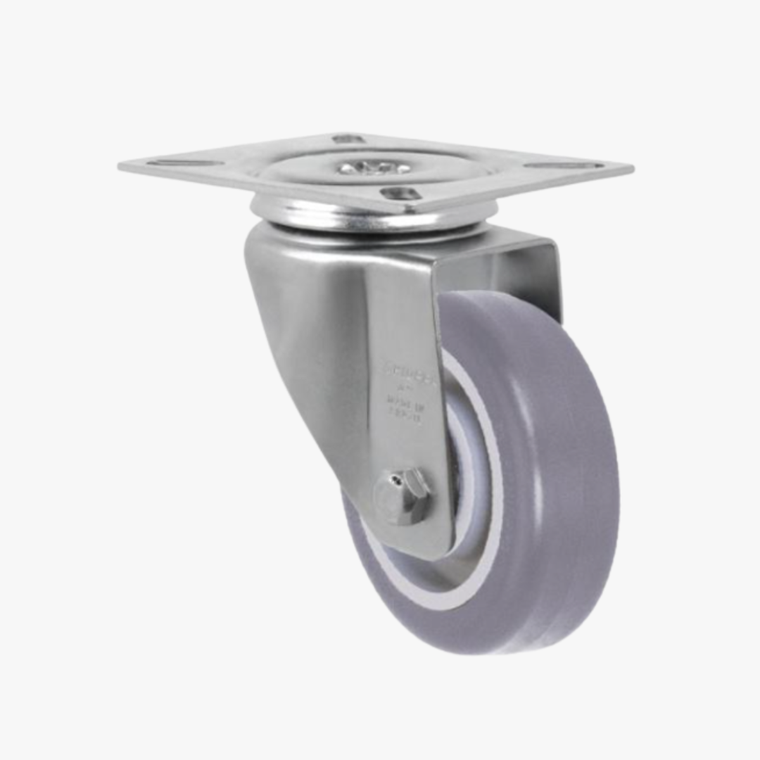 Garfo: Fabricado em chapa estampada e cabeçote com dupla pista de esferas, acabamento zincado. Eixo da roda parafusado.