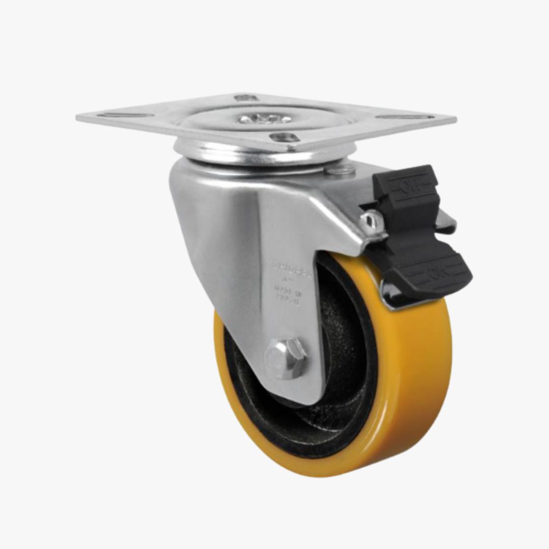 Roda P: Poliuretano Moldado. Dureza: 90 Shore A. (-40ºC a +80ºC). Produzidas com revestimento em poliuretano moldado e núcleo em ferro fundido cinzento. Ideais para aplicações nos mais diversos tipos de superfícies e ambientes. Suportam altas cargas, protegem o piso, necessitam de menor esforço para movimentação, produzem baixo nível de ruídos no deslocamento e têm excelente durabilidade. Possuem excelente resistência a abrasão, impactos, intempéries e produtos químicos como graxas, óleos, sais e solventes. Podem ser utilizadas a uma velocidade de até 4km/h.