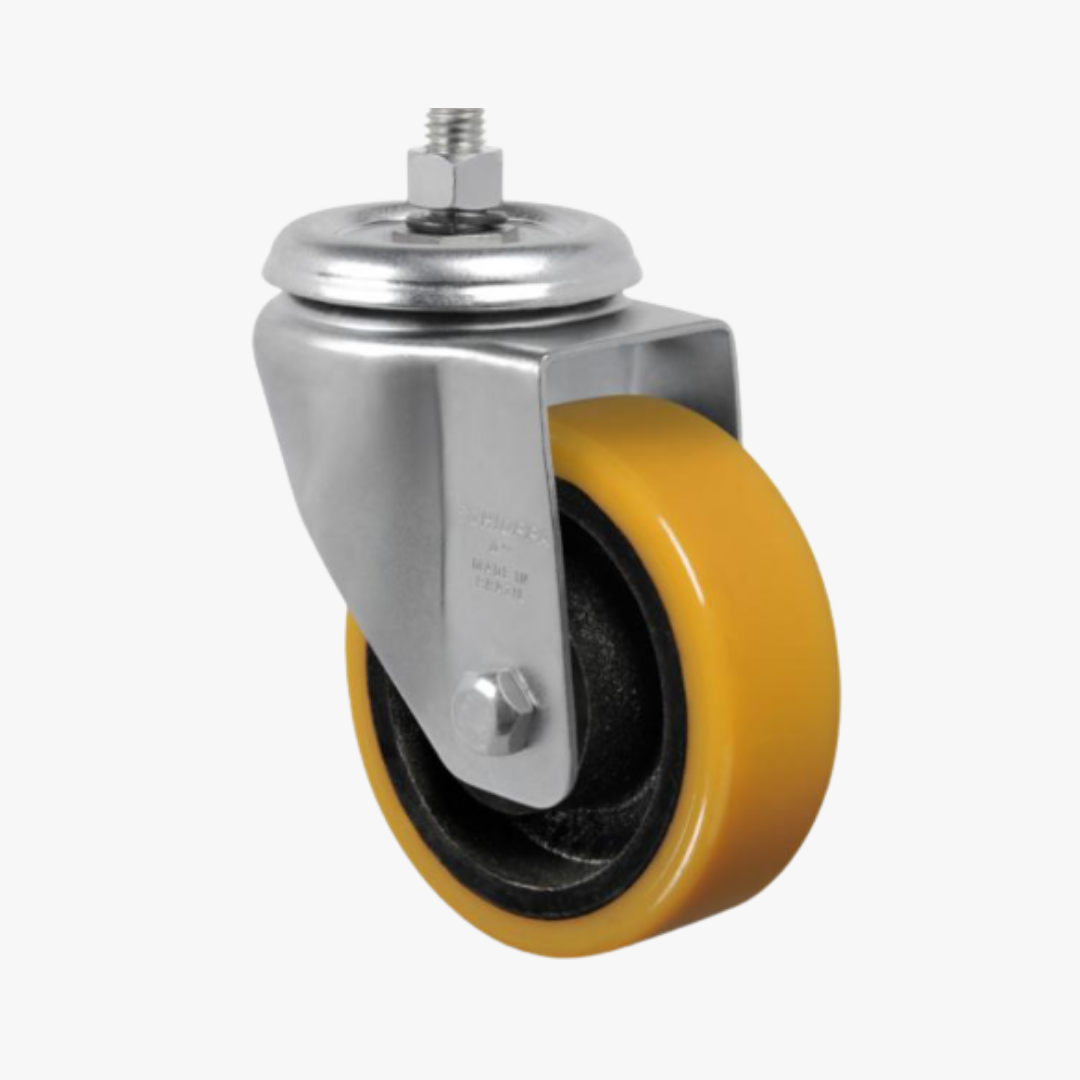 Roda P - Poliuretano Moldado. Dureza: 90 Shore A. (-40ºC a +80ºC). Produzidas com revestimento em poliuretano moldado e núcleo em ferro fundido cinzento. Ideais para aplicações nos mais diversos tipos de superfícies e ambientes. Suportam altas cargas, protegem o piso, necessitam de menor esforço para movimentação, produzem baixo nível de ruídos no deslocamento e têm excelente durabilidade. Possuem excelente resistência a abrasão, impactos, intempéries e produtos químicos como graxas, óleos, sais e solventes. Podem ser utilizadas a uma velocidade de até 4km/h.
