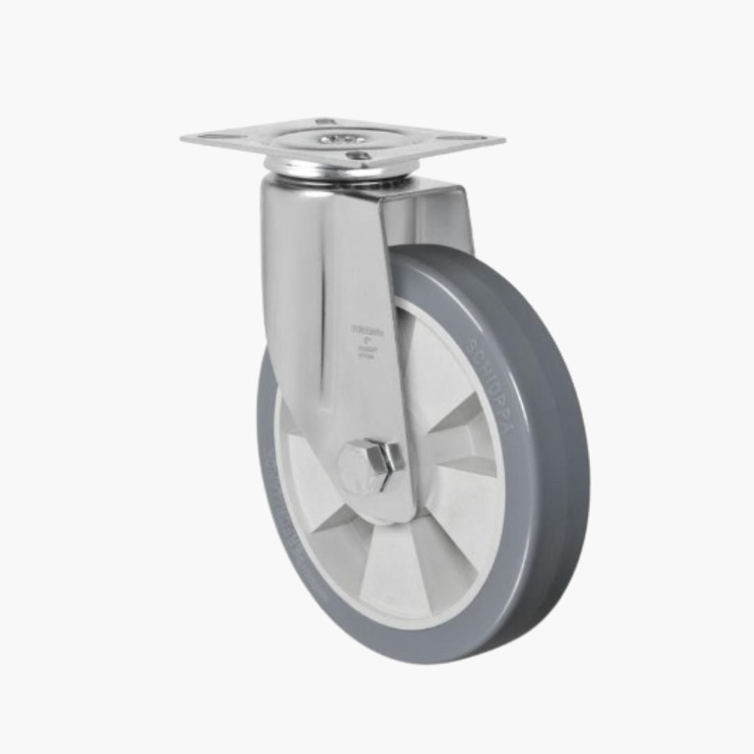 Roda BP: Composto Termoplástico com PVC. Dureza: 80 Shore A. (-10ºC a +50ºC). Produzidas com revestimento em composto termoplástico com PVC e núcleo em polipropileno copolímero recicláveis. Proporcionam rodagem macia e silenciosa, ótima proteção ao piso, excelente resistência química, boa resistência ao desgaste e aos impactos, resultando em ótima relação custo benefício. A velocidade de trabalho indicada é até 4km/h.
