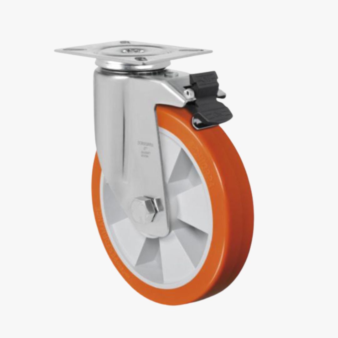 RODA UP - Poliuretano Termoplástico. Dureza: 90 Shore A. (-20ºC a +70ºC). Produzidas com revestimento em poliuretano termoplástico elastollan e núcleo em polipropileno copolímero recicláveis. Ideais para quem procura excelente capacidade de carga alinhada a uma ótima proteção do piso com baixo ruído no deslocamento, proporcionam excelente resistência a abrasão e impactos. Resistentes a graxas, óleos minerais e alguns ácidos. A velocidade de trabalho indicada é até 4 km/h.