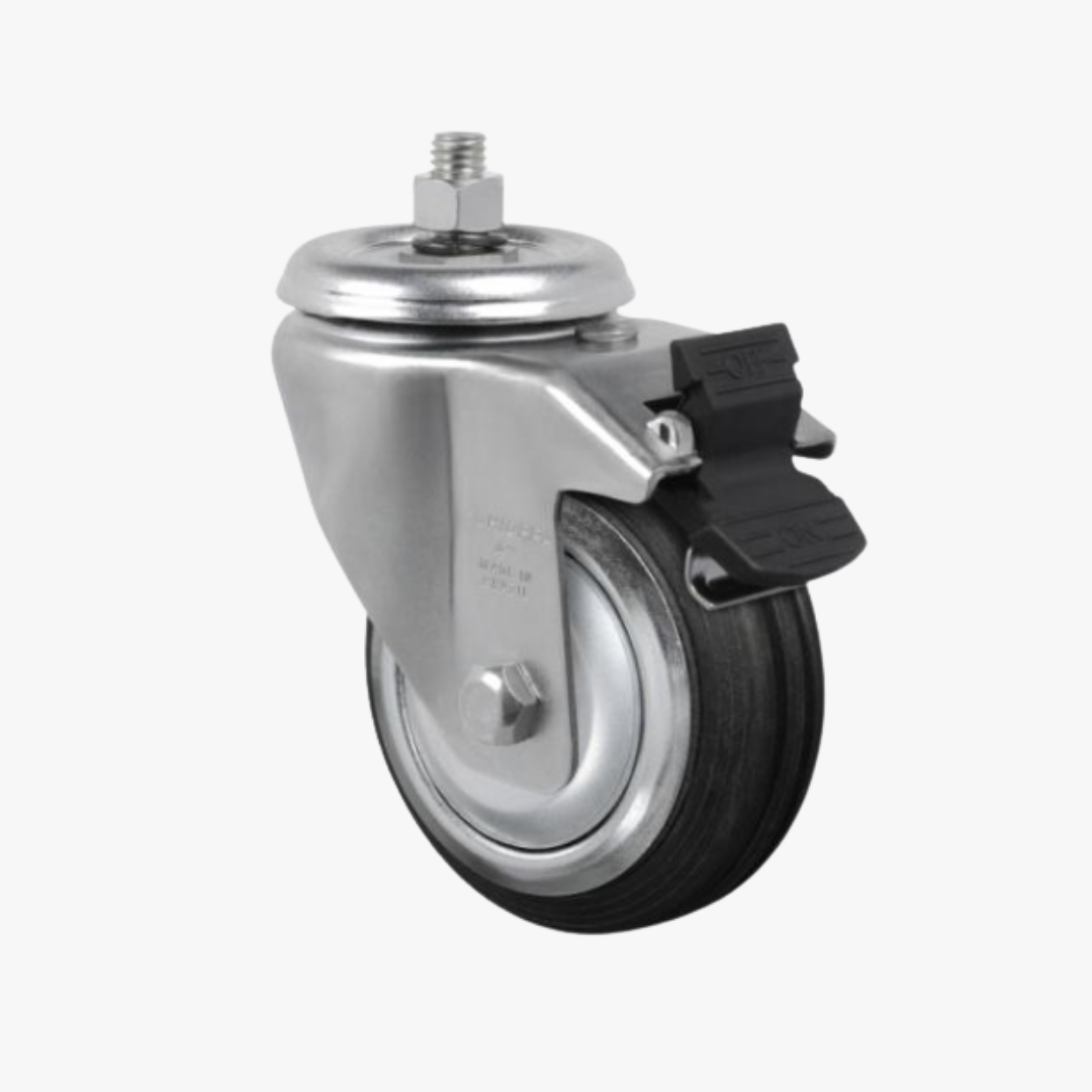 RODA BD - Borracha Moldada com Núcleo em Chapa Estampada. Dureza: 80 Shore A. (-20ºC a +70ºC) Produzidas com aro de borracha maciço, com núcleo em chapas de aço carbono estampado, com acabamento de zincado. São leves e resistentes, tem rodagem macia e silenciosa, e são indicadas para serviços leves em pisos em bom estado. A velocidade de trabalho indicada é até 4 km/h.