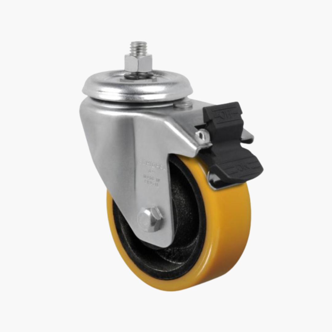 Garfo: Fabricado em chapa estampada e cabeçote com dupla pista de esferas, acabamento zincado. Eixo da roda parafusado