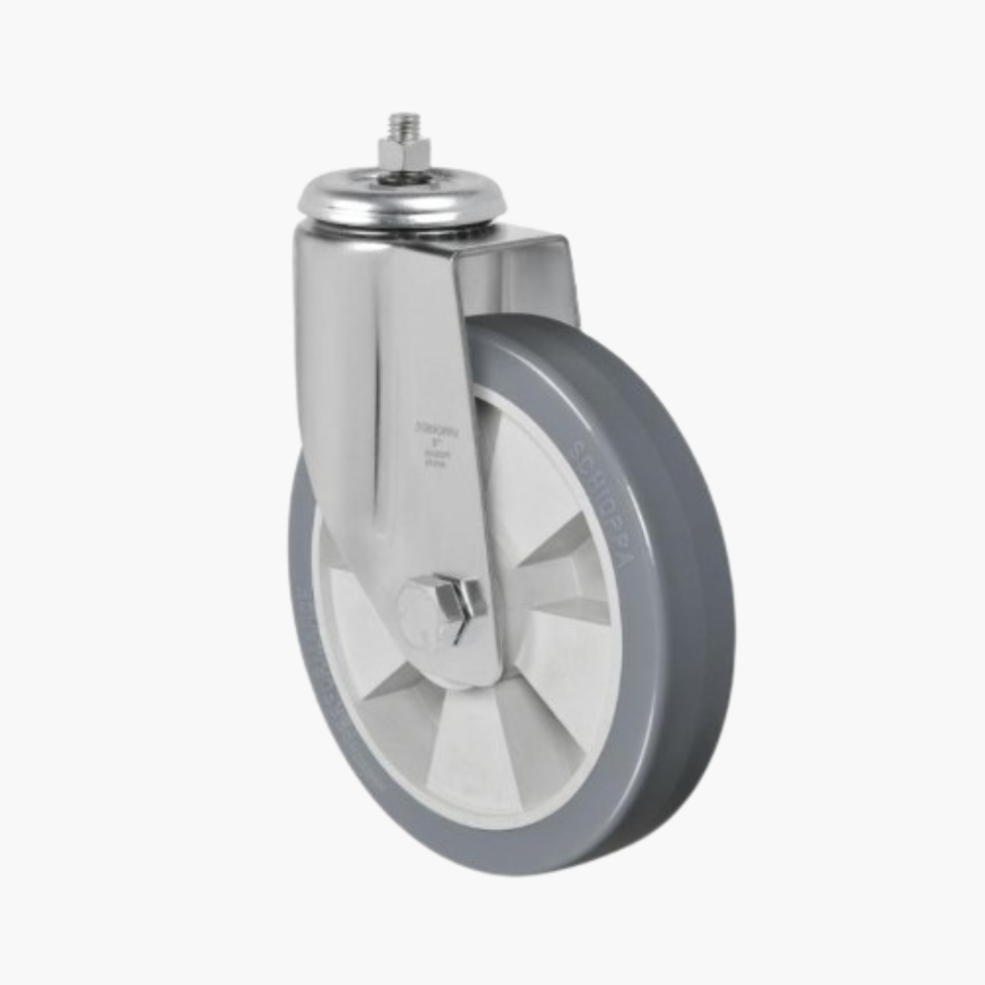 Garfo: Fabricado em chapa estampada e cabeçote com dupla pista de esferas, acabamento zincado. Eixo da roda parafusado.