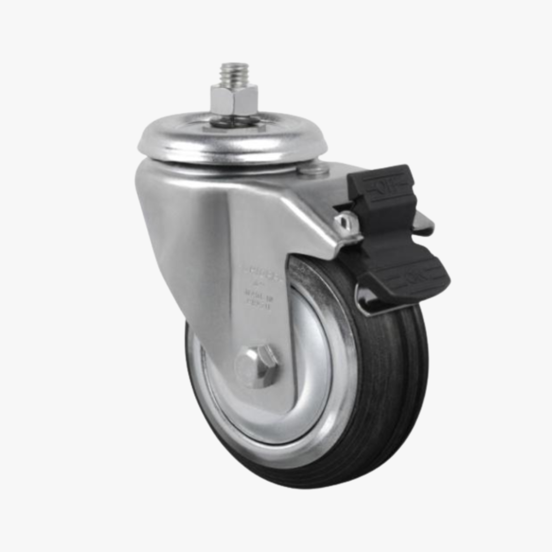 Roda BD: Borracha Moldada com Núcleo em Chapa Estampada. Dureza: 80 Shore A. (-20ºC a +70ºC). Produzidas com aro de borracha maciço, com núcleo em chapas de aço carbono estampado, com acabamento de zincado. São leves e resistentes, tem rodagem macia e silenciosa, e são indicadas para serviços leves em pisos em bom estado. A velocidade de trabalho indicada é até 4 km/h.