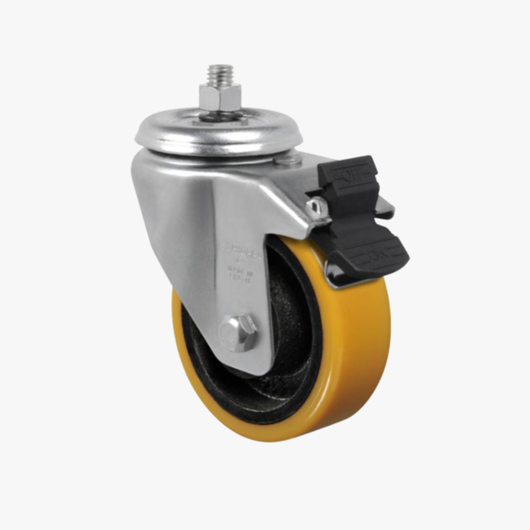 Garfo: Fabricado em chapa estampada e cabeçote com dupla pista de esferas, acabamento zincado. Eixo da roda parafusado.