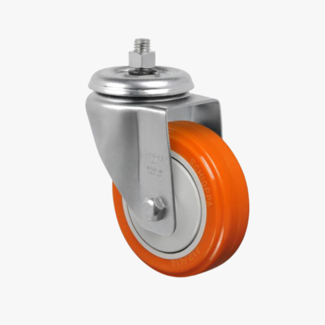 Roda UP: Poliuretano Termoplástico. Dureza: 90 Shore A. (-20ºC a +70ºC). Produzidas com revestimento em poliuretano termoplástico elastollan e núcleo em polipropileno copolímero recicláveis. Ideais para quem procura excelente capacidade de carga alinhada a uma ótima proteção do piso com baixo ruído no deslocamento, proporcionam excelente resistência a abrasão e impactos. Resistentes a graxas, óleos minerais e alguns ácidos. A velocidade de trabalho indicada é até 4 km/h.