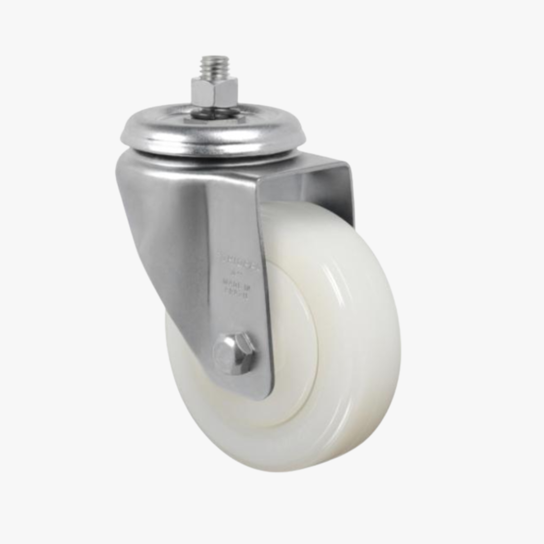 Roda NT - Nylon Técnico. Dureza: 75 Shore D. (-40ºC a +110ºC). Produzidas com revestimento e núcleo em nylon poliamida 6.0 de alta qualidade. São leves e possuem ótima resistência mecânica, rodam com muita facilidade exigindo menor esforço para manobras e movimentação. Ideais para aplicações em ambientes úmidos, são resistente as graxas, óleos, sais e alguns tipos de ácidos. Fabricadas com material reciclável. A velocidade de trabalho indicada é até 4 km/h.